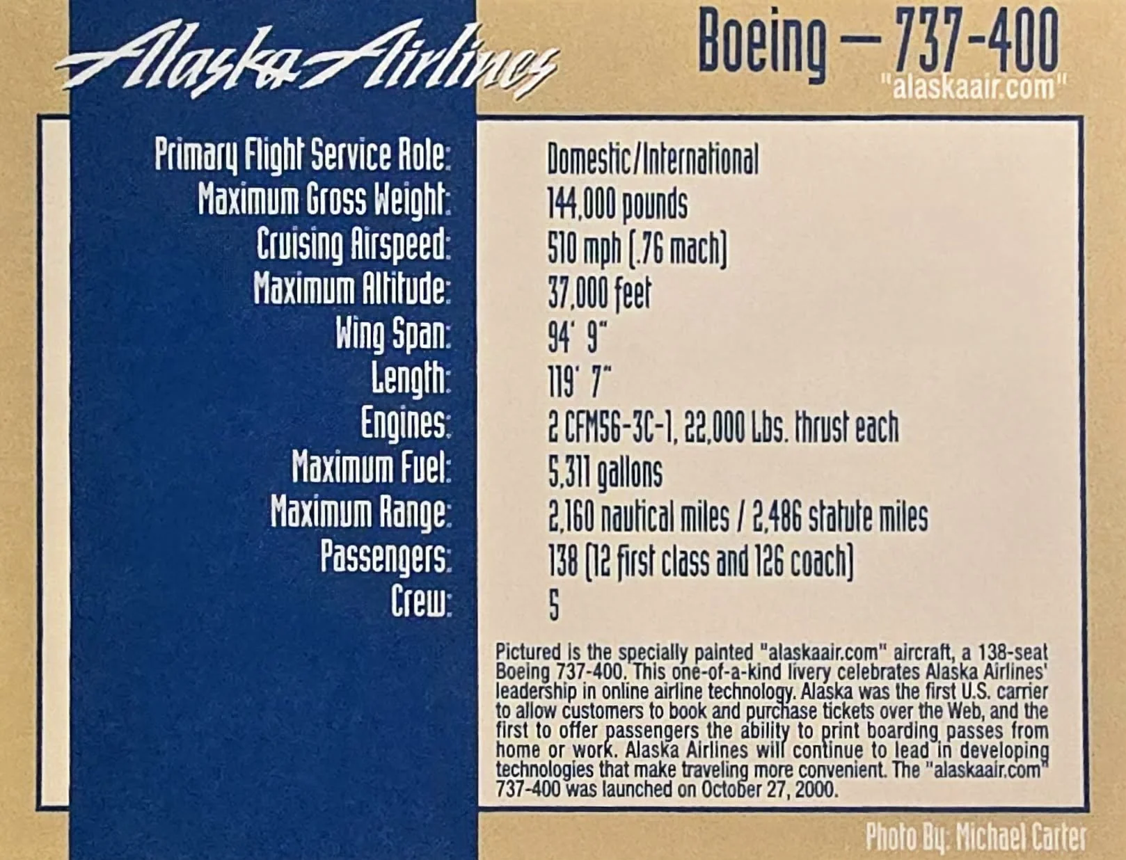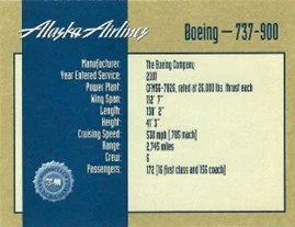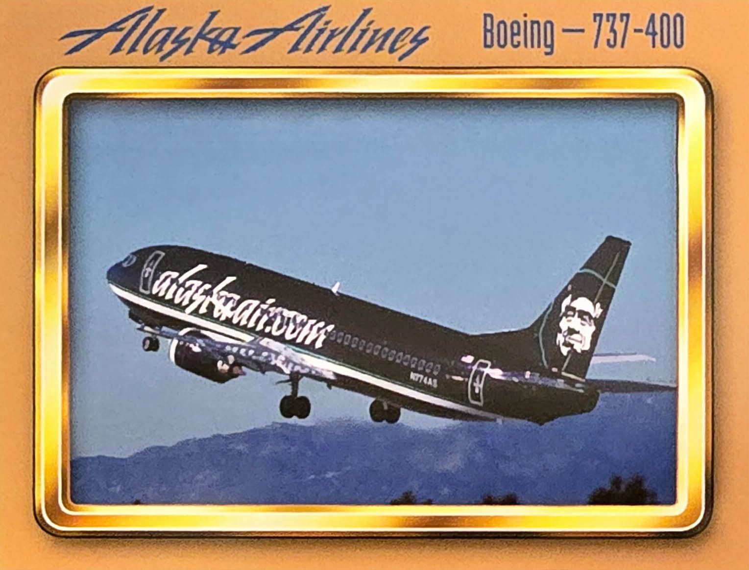 In the early 2000s, Alaska released a series of gold-bordered cards in an odd size of 4.25” X 3.25”. This is where there are other variants of each card, some with the seal in the lower corner adn some with “Alaskaair.com” under the aircraft. Others have a subscript on the back. We know we are missing a lot from this set. If you find cards we don't have, please let us know.