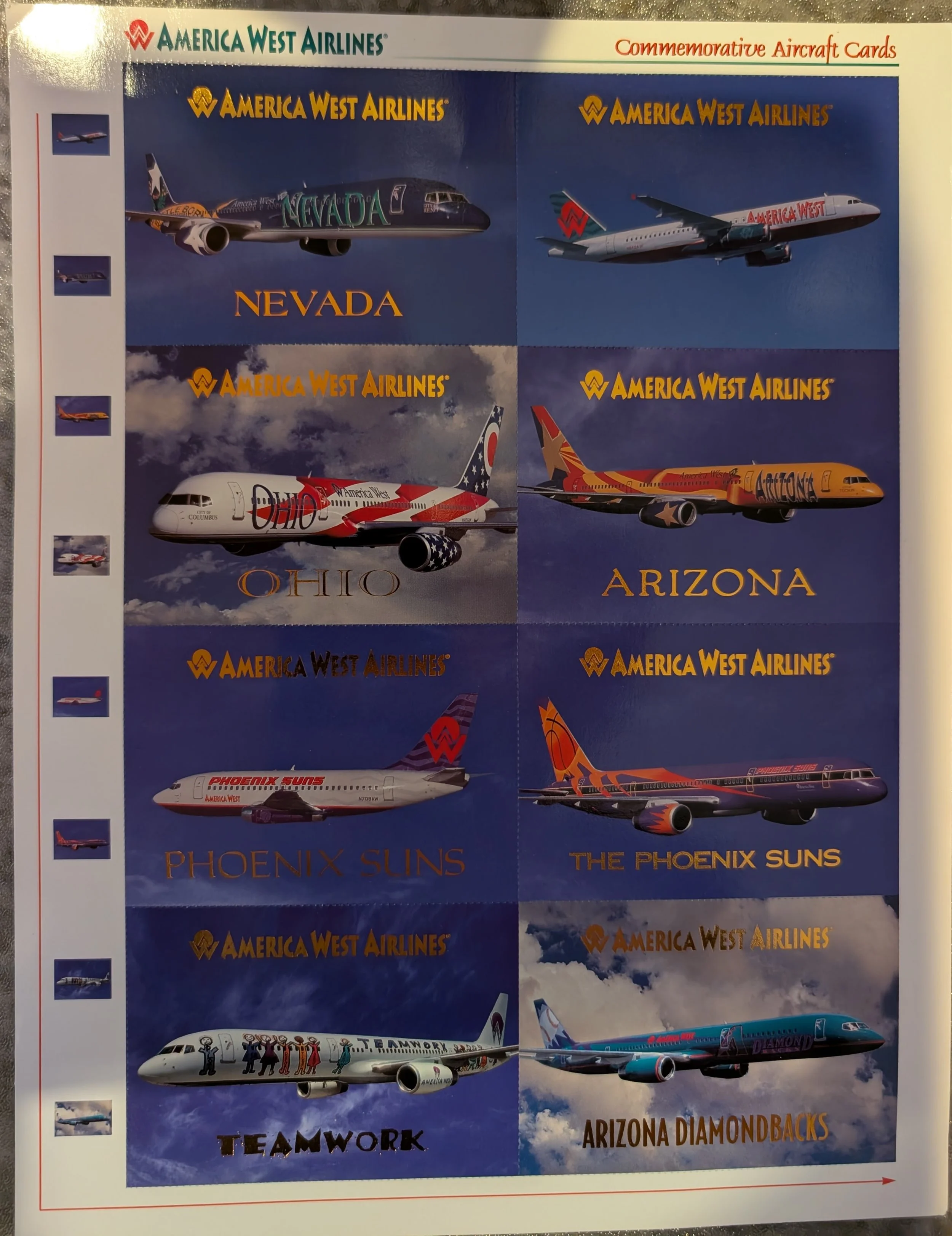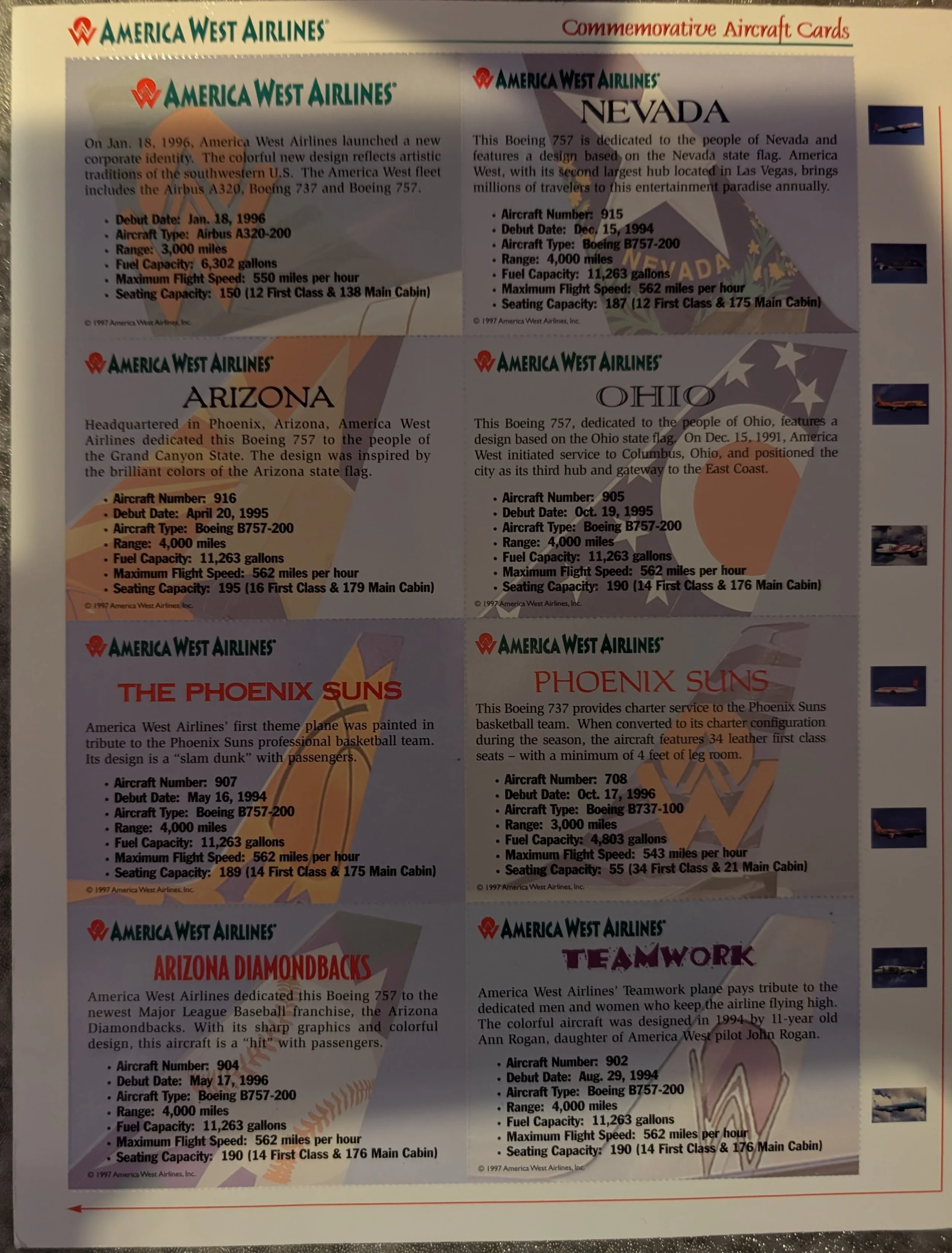 We do not know much about these cards. If you have information, please let us know. They were printed in 1997 on a full sheet. They were perforated all around. Each card celebrates a different livery from around the fleet.