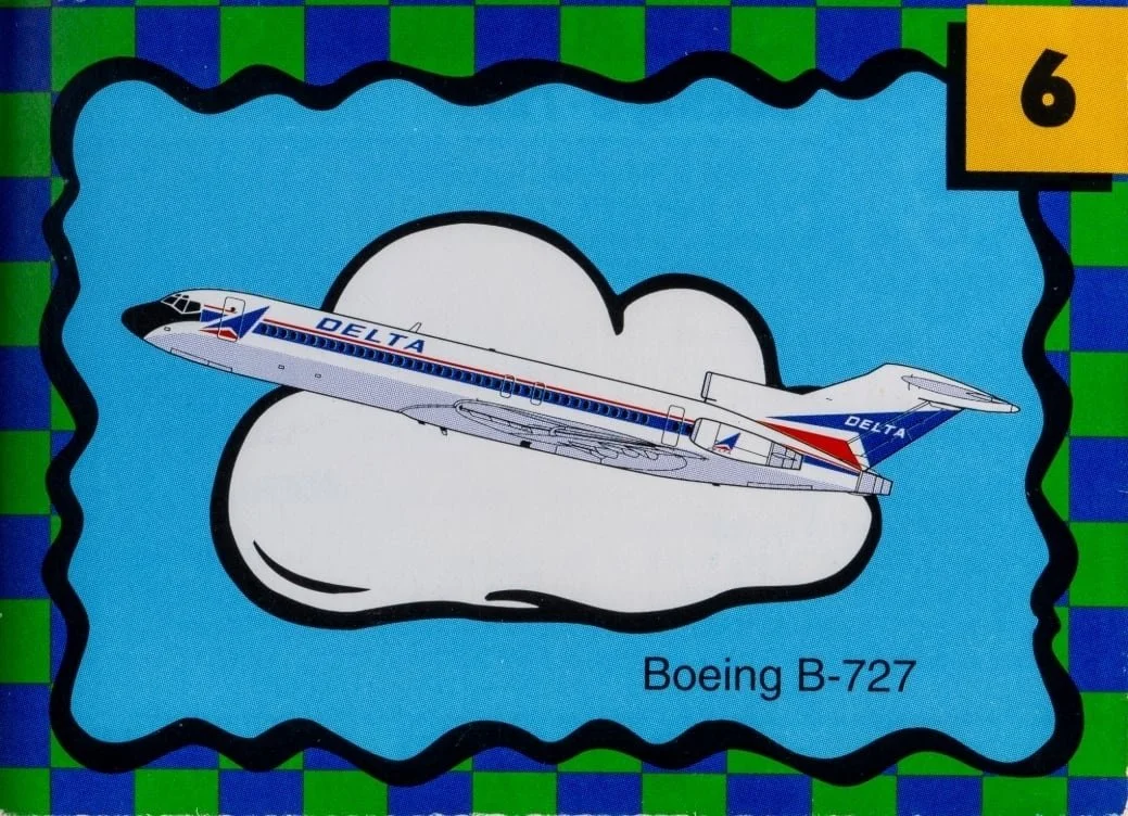 Illustration of a delta airplane flying through the sky, with a cloud behind it, on a checkered green and blue background. The text "Boeing B-727" is at the bottom, and the number 6 is in the top right corner.