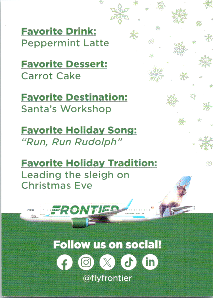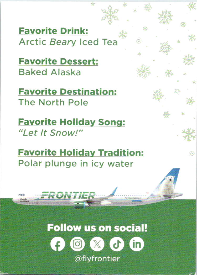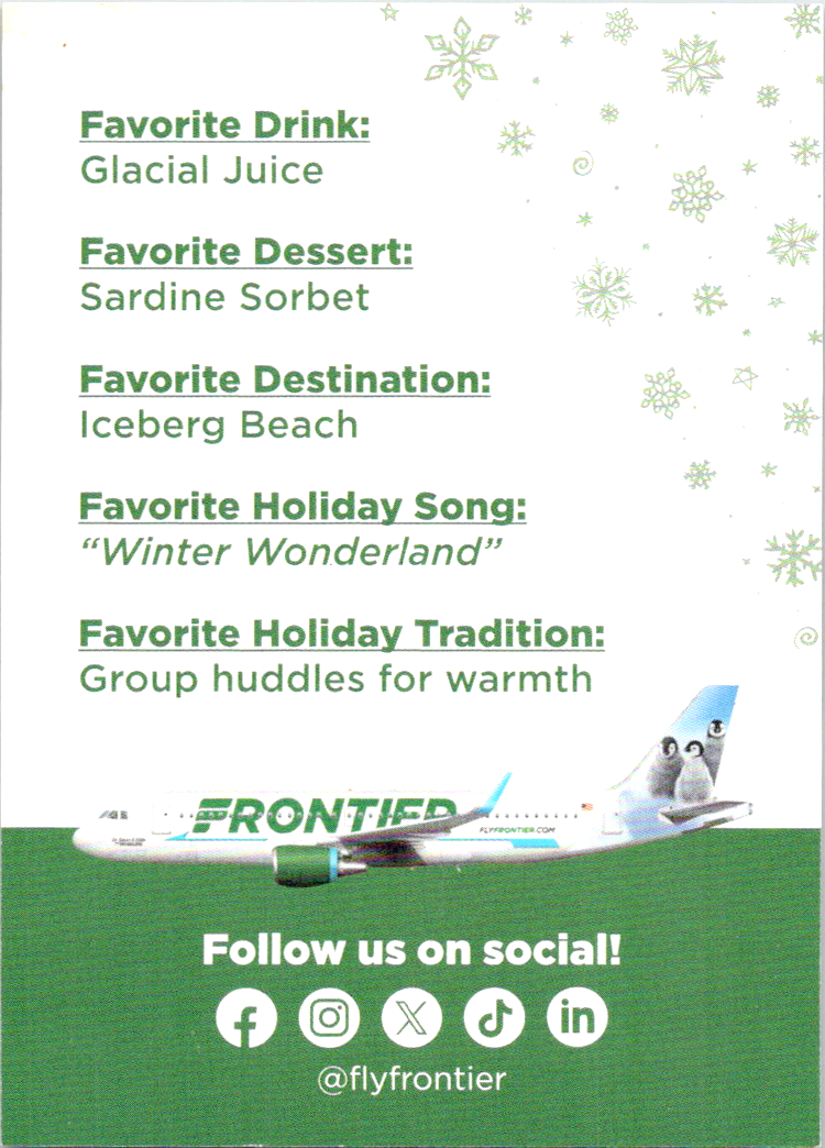 Frontier Airlines put out a set of Christmas cards. I believe they came out in 2022, but I can not find a year for sure.